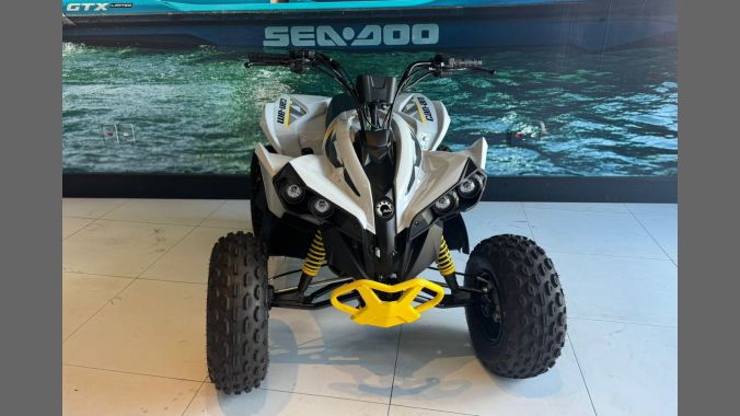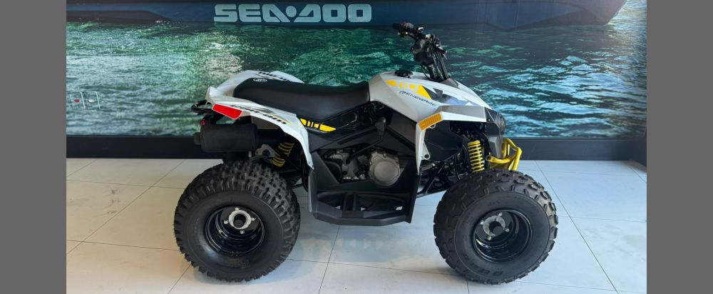 Quadriciclo Can-Am Renegade 110 EFI, ano 2024. Com motor de 4 tempos, transmissão de velocidade única, limitador de velocidade e injeção eletrônica de combustível (EFI), esse veículo tem um desempenho ideal para os jovens que estão começando a conhecer o off-road. Aproveite esta oportunidade!